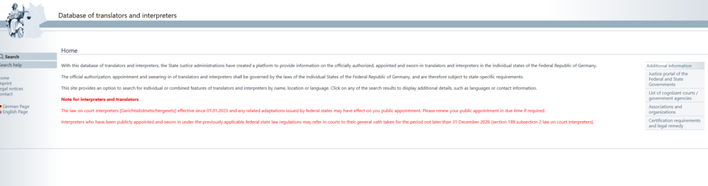 Imagen: Base de datos de l@s intérpretes jurídic@s de la República Federal de Alemania, <https://www.justiz-dolmetscher.de/Recherche/>